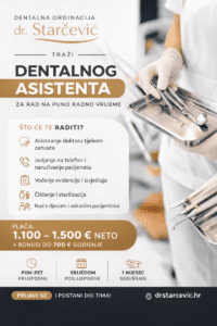 Dentalna ordinacija dr. Starčević u Zagrebu traži dentalnog asistenta / asistenticu za rad na puno radno vrijeme (ugovor na neodređeno) uz probni rok od 3 mjeseca.